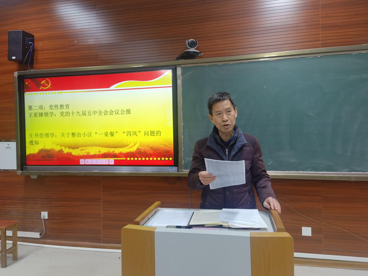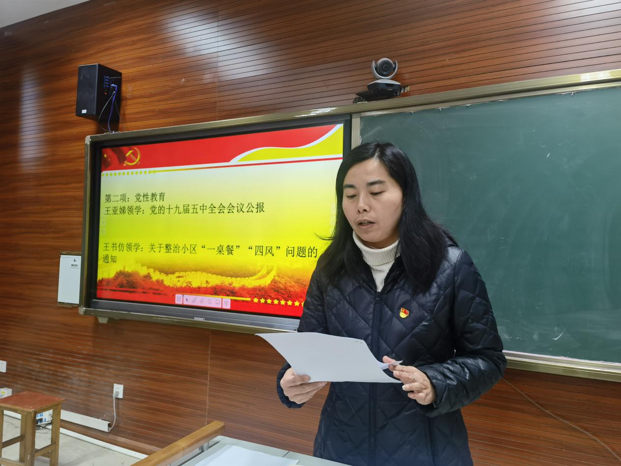在回顧初心和交納黨費后,王亞娣書記帶領(lǐng)大家學(xué)習(xí)了《中國共產(chǎn)黨第十九屆中央委員會第五次全體會議公報》,明確了我國實現(xiàn)社會主義現(xiàn)代化的遠景目標(biāo),特別指出《公報》中對“四個全面”表述的新變化,以及全會提出的“一個核心”和十一項重要舉措等內(nèi)容?!安蛔⒅貙W(xué)習(xí),認識便會落后,思想上也很容易出問題?!蓖鮼嗘窌浱貏e強調(diào)黨員要加強學(xué)習(xí)黨刊黨報,提高思想認識和黨性修養(yǎng)。之后,王書仿同志帶領(lǐng)大家學(xué)習(xí)了《關(guān)于整治小區(qū)“一桌餐”“四風(fēng)”問題的通知》,警醒黨員們在日常工作和生活中以身作則,規(guī)范言行,切記不踩“紅線”。